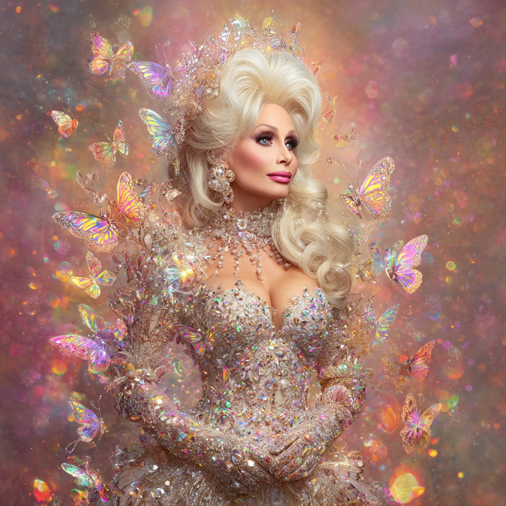 "Love Is Like a Butterfly" transforms Dolly into an ethereal butterfly goddess with her signature platinum beehive, enveloped in a galaxy of iridescent butterflies emerging from her rhinestone-encrusted gown. Against a dreamy backdrop of golden bokeh lights, she embodies celestial glamour while referencing her 1974 hit song and philosophy that butterflies "don't sting, don't bite, and are so beautiful" - much like Dolly herself. The piece showcases her aesthetic philosophy: "It costs a lot of money to look this cheap!"