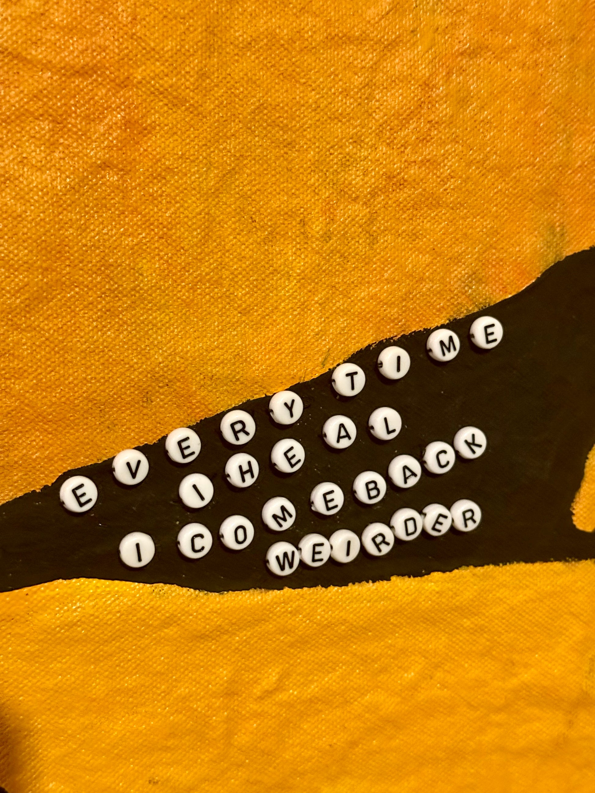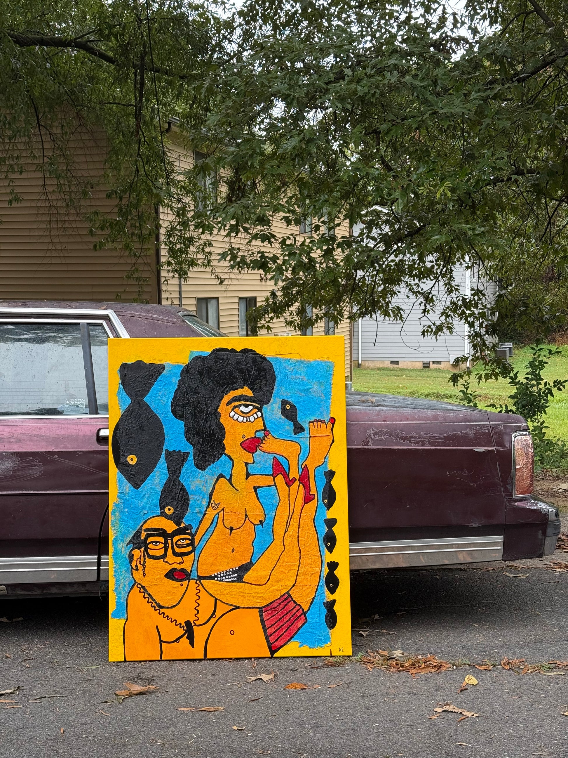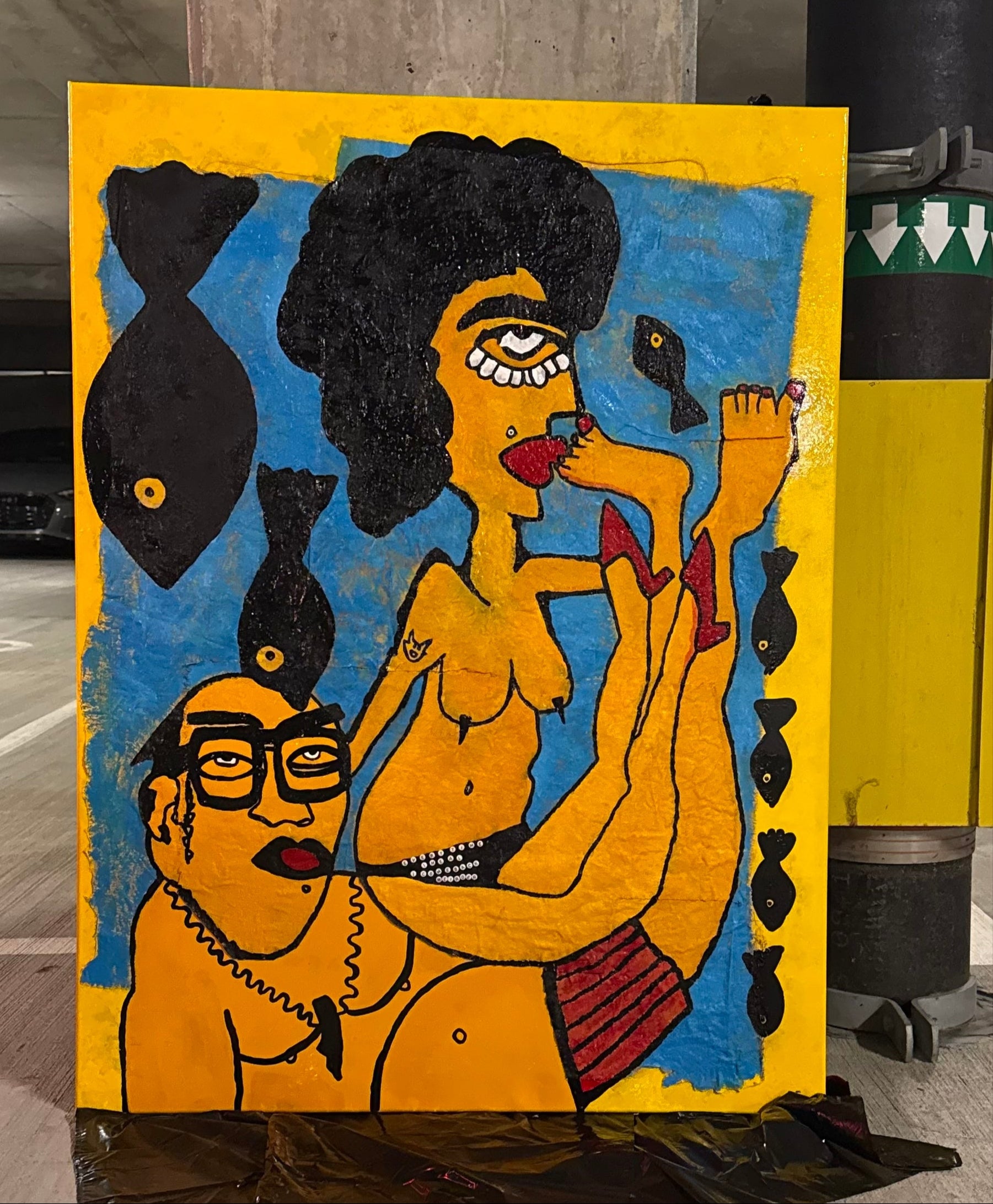 The Weird Italian Doll comes alive here—perched on a man, limbs tangled in surreal play. Seven fishes swirl around her, borrowed from the Feast of the Seven Fishes but reimagined as symbols of mystery and passion. Bright yellow and sharp reds turn the scene into a sexy, mythic spectacle: part tradition, part temptation. And yet it’s also a party—a wild celebration of being weird inside a traditional world, where strangeness, fun, and desire all dance together.