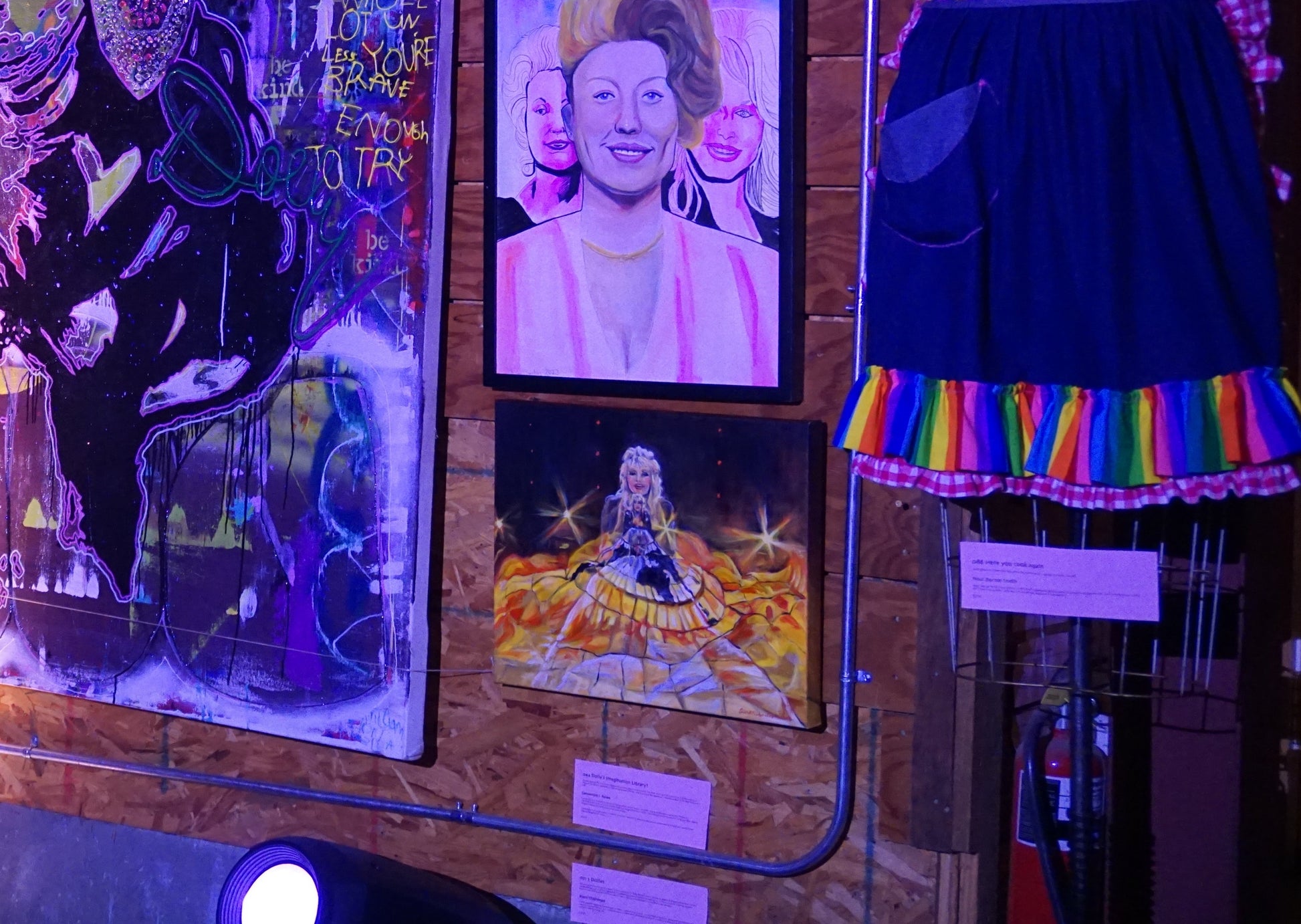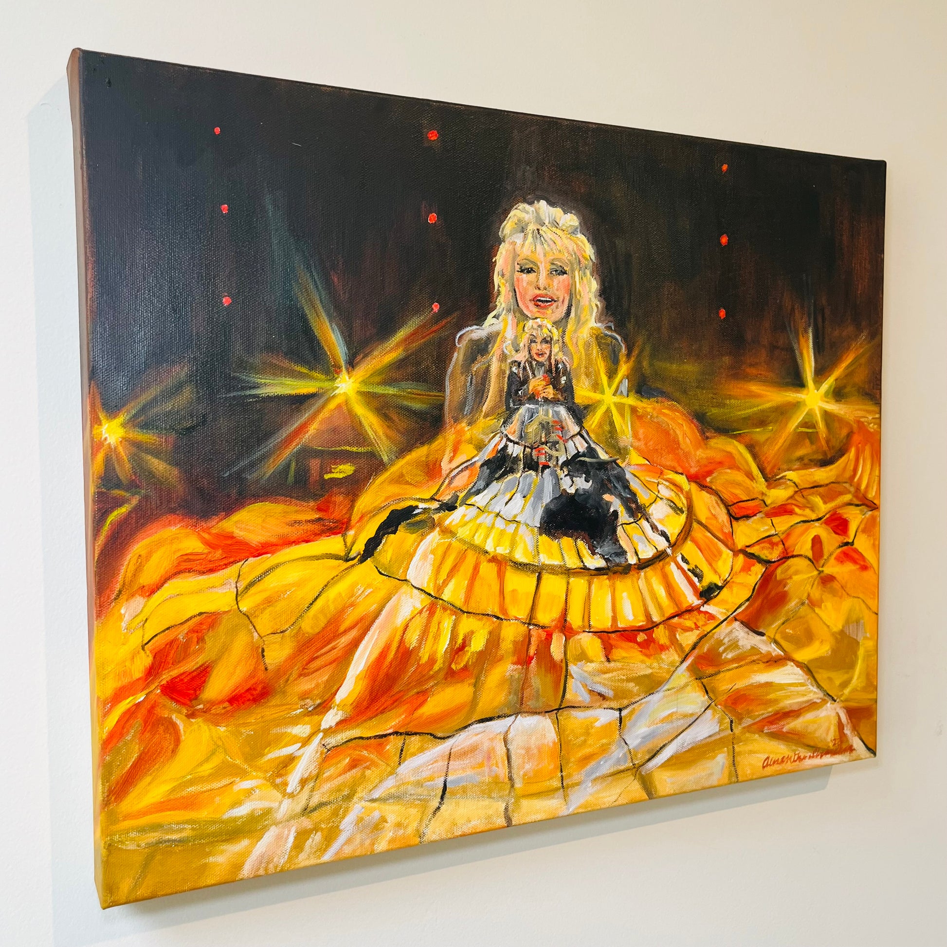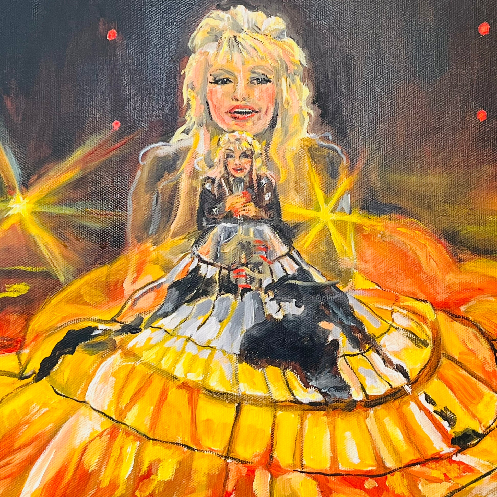 "This painting depicts a still frame captured from a video of Dolly Parton singing her new song “World on Fire” at the recent 2023 Academy of Country Music Awards. The sound of her imploring her audience to act out of love, and the image of Dolly standing with a billowing skirt with the world painted on it and glowing, fiery lights beneath it, was very powerful to me. The still frame captured a double exposure of two Dolly’s—one more close-up and one from a distance to see the whole scene. The double image of Dolly seemed to show her performer persona as well as her activist/humanitarian larger-than-life persona. She seems to be calling others to action in her song, to help save the world from greed and excess by coming together with love."