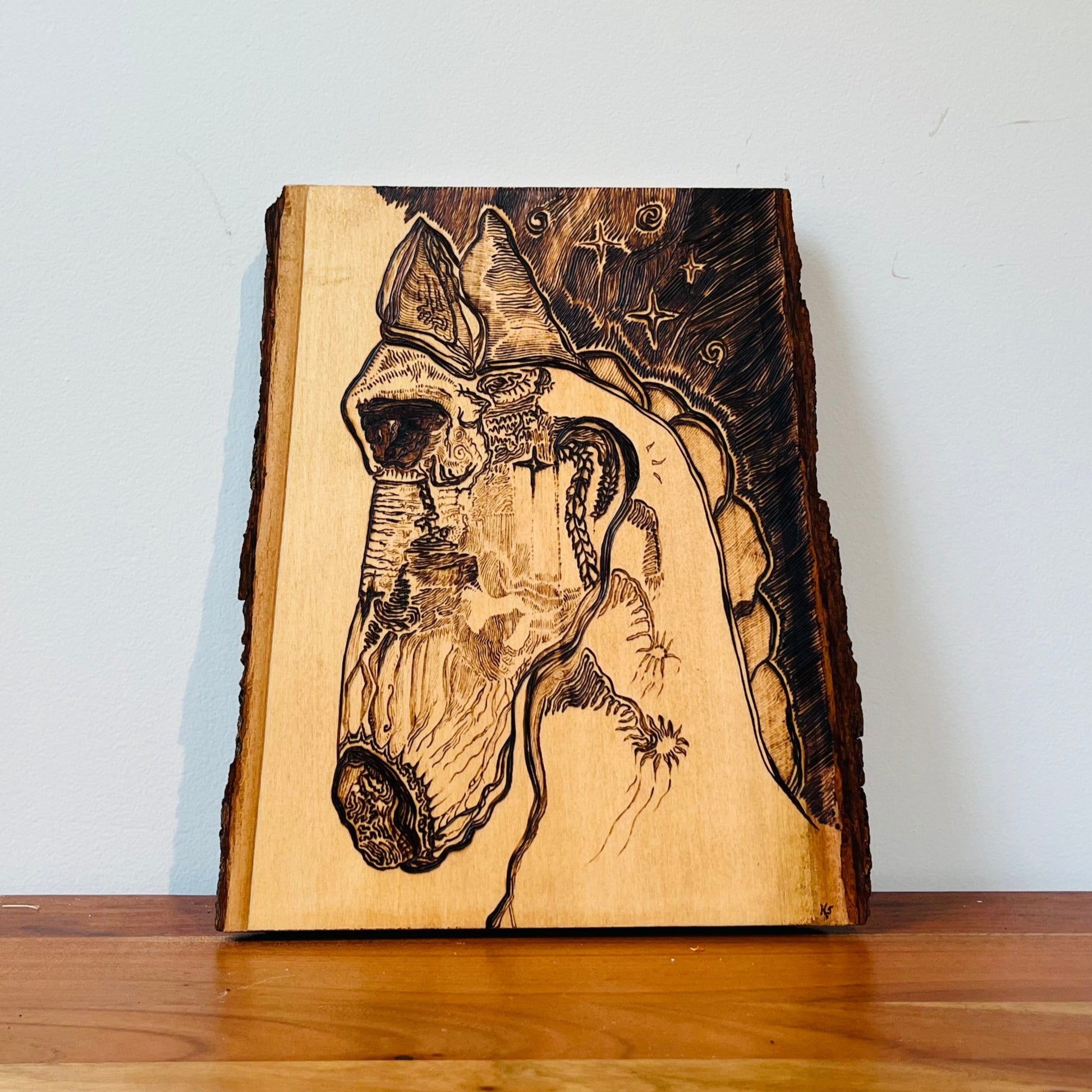 Woodburned illustration of a horse, in honor of all the horses Dolly owns and has sung about.