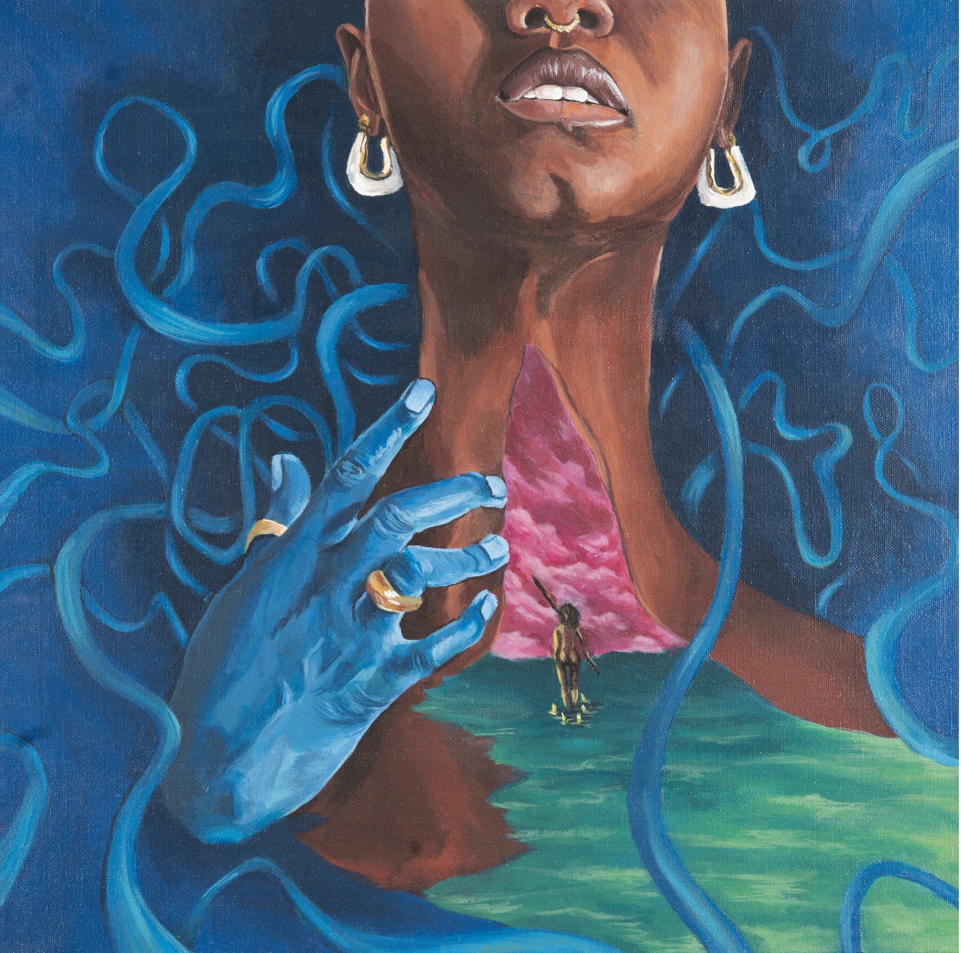 The inspiration behind this piece, like most of my work is introspection. It affirms the mantra: “the more I exercise my inner voice the bigger my world becomes.” I recognize that my past hesitancy to speak often came from a place of compassion and wanting to preserve peace for others. I now stand in giving voice to my truth because it deserves that space and honoring my truth doesn’t create conflict. It can actually heal spaces and expand them.