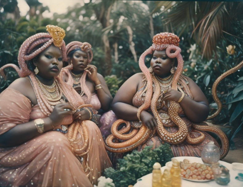 In a mystical garden, a group of magical Octofolk femmes sit together, adorned in high-fashion outfits that shimmer with glitter. Their regal presence is complemented by ethereal greenery and soft, glowing light, creating an atmosphere of enchantment and elegance.
