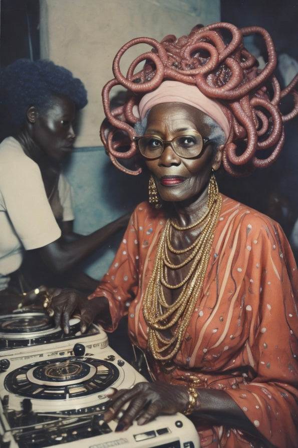 An older Octofolk woman DJs at an indoor party, her hands gracefully manipulating the turntables. Dressed in high fashion, her striking appearance commands attention as she mixes vibrant beats, blending elegance and otherworldly charm.